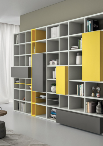 Le pareti componibili sono perfettamente integrabili fra loro, elementi in metallo e non solo creano geometrie inedite e colorate.