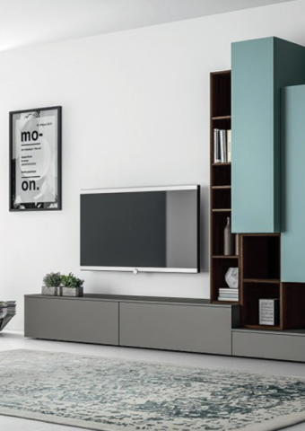 Il Sistema giorno è composto da elementi modulari permette di attrezzare la parete del salotto con contenitori, pensili o con un sistema a spalla portante.