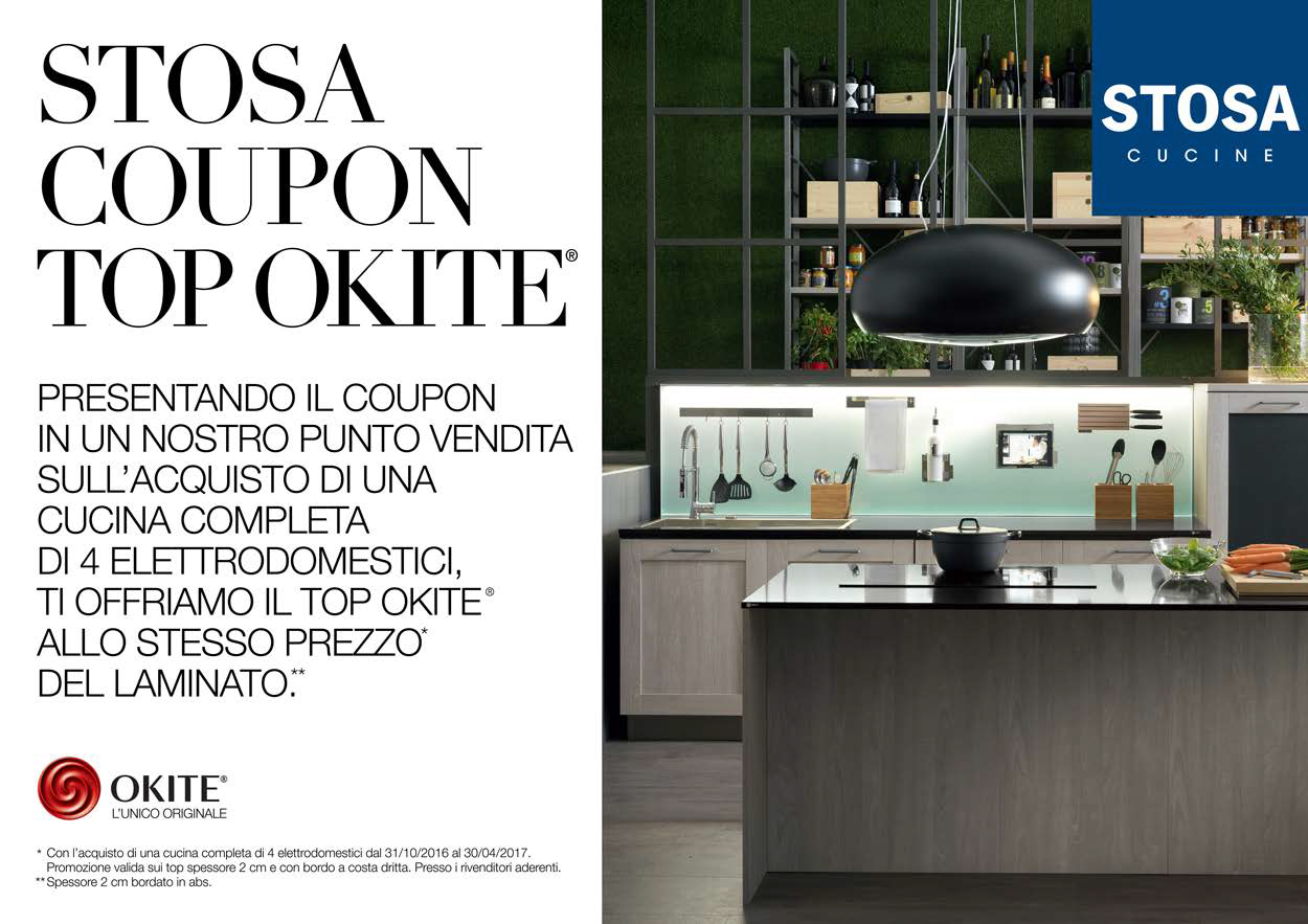 * Con l’acquisto di una cucina completa di 4 elettrodomestici fino al 30/04/2017. Promozione valida sui top spessore 2 cm e con bordo a costa dritta. Presso i rivenditori aderenti.